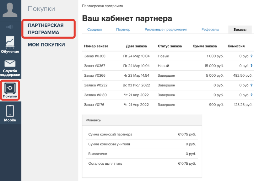 - Через сутки после оплаты заказа в вашем Кабинете Партнера вам начисляется комиссия в размере 10% от суммы заказа
