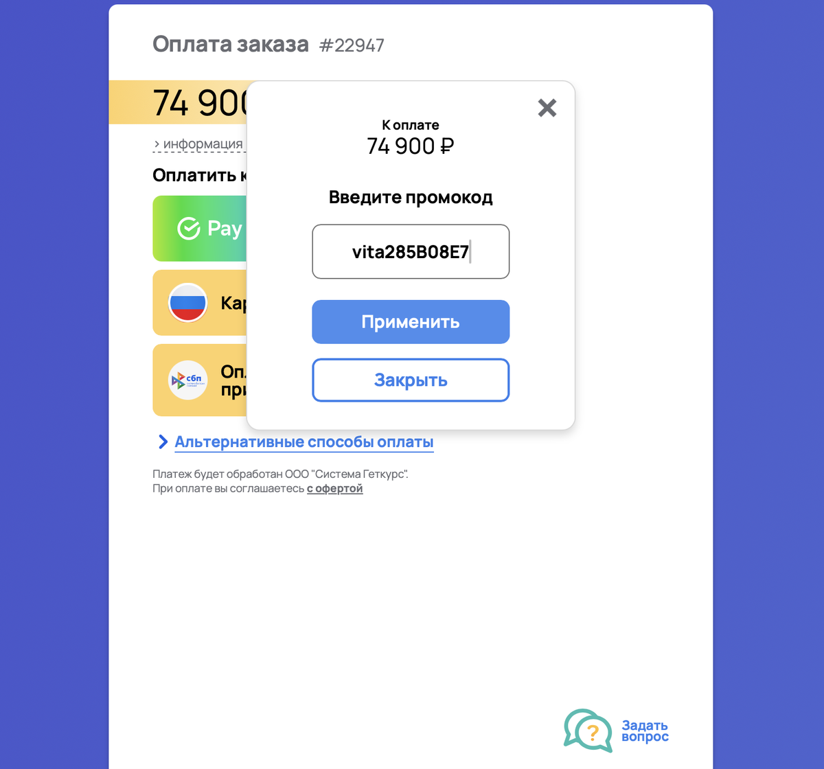 - В открывшемся окошке вводим промокод и нажимаем "Применить"